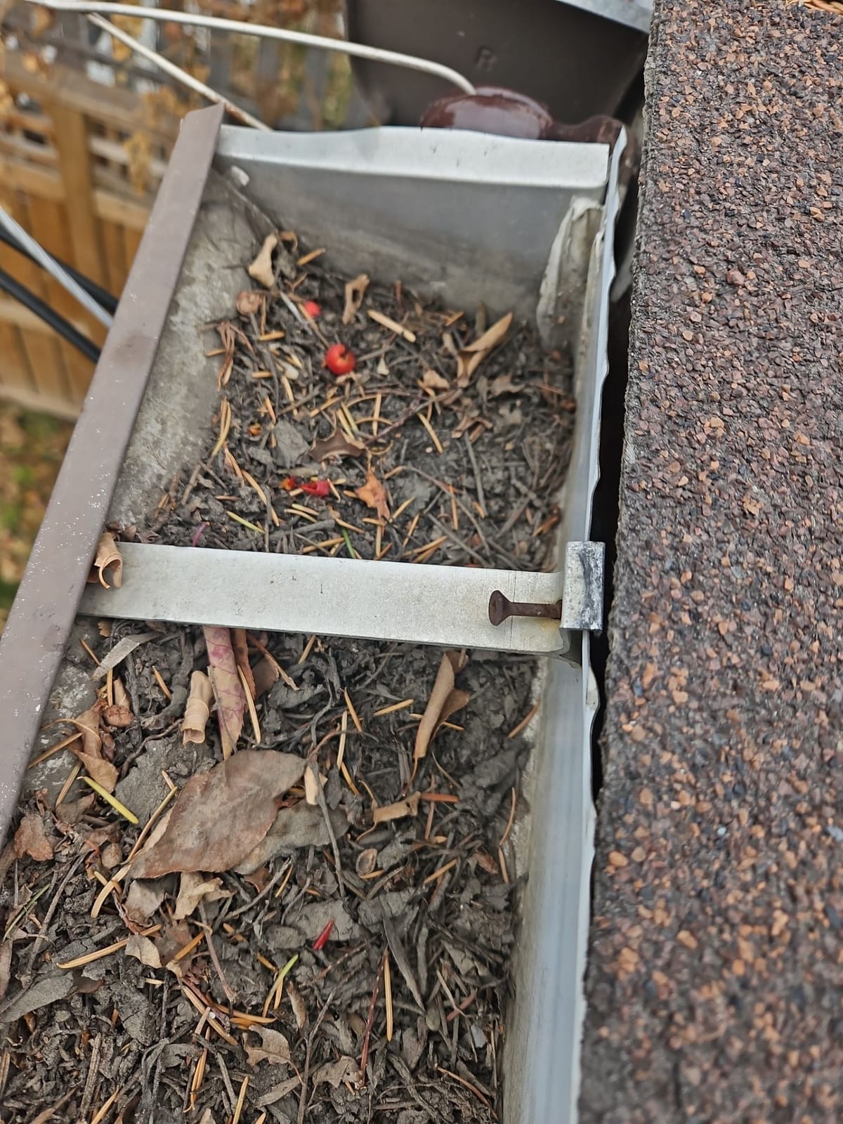 Leaves, asphalt granules and dirt piled through years on eaves, at 18 Ave NE Calgary, AB T2E 1N5