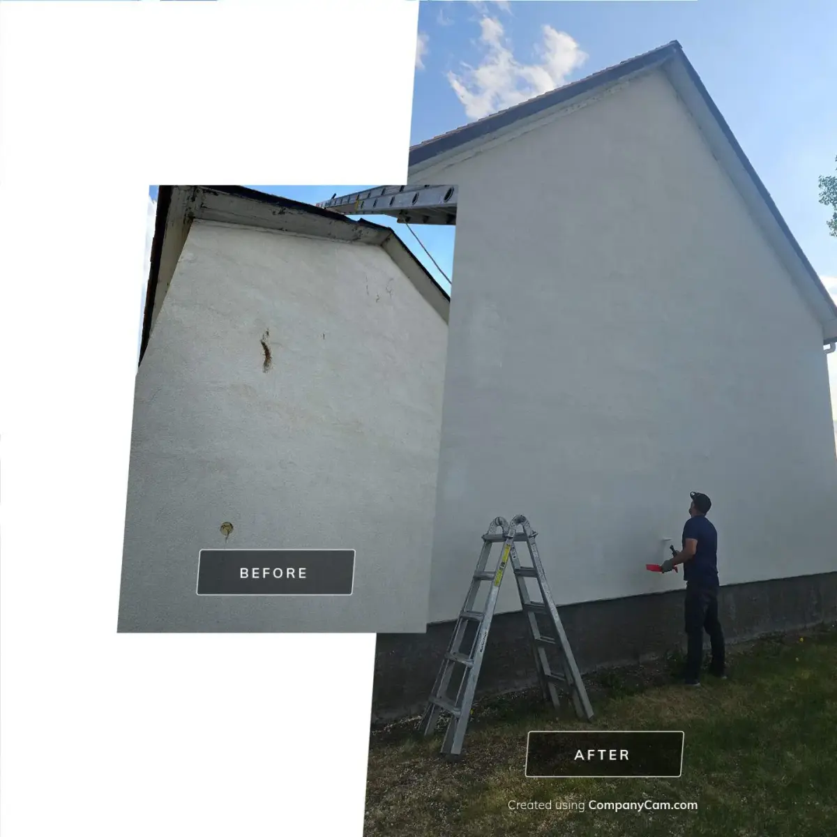 We demo’d the loose stucco, applied adhesive bonder, high quality rapid set fine stucco, finished with colour matched painting. As you can see in the before & after photo below, you can’t notice where the damage was initially.